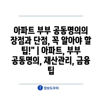 아파트 부부 공동명의의 장점과 단점, 꼭 알아야 할 팁!” | 아파트, 부부 공동명의, 재산관리, 금융 팁